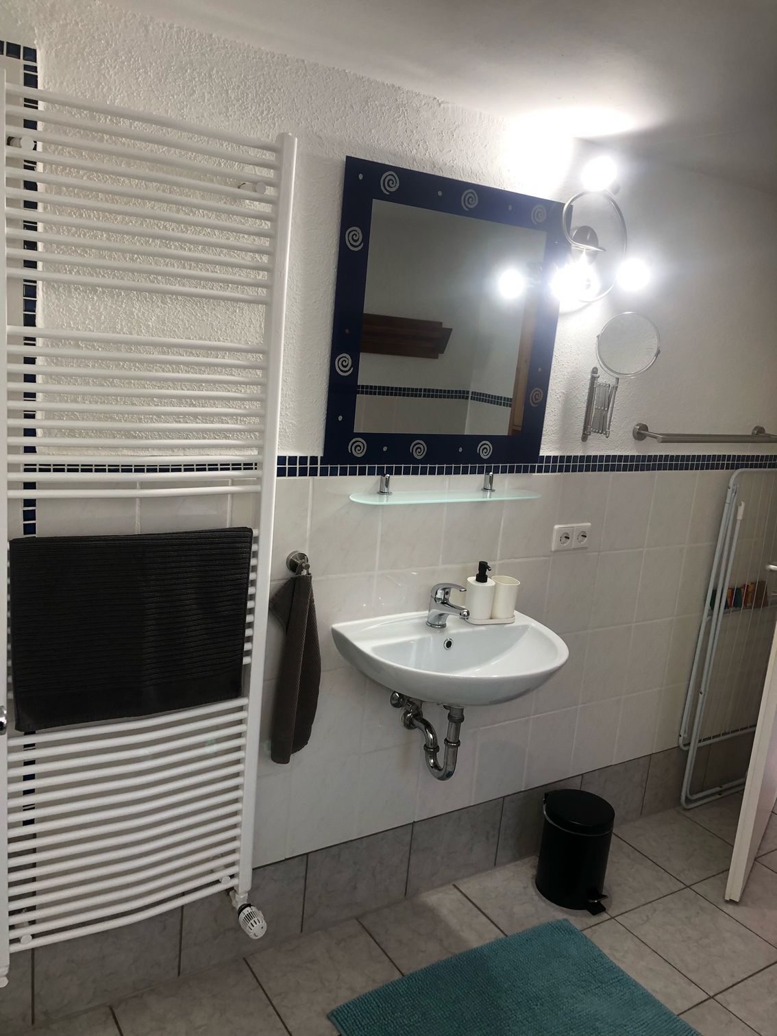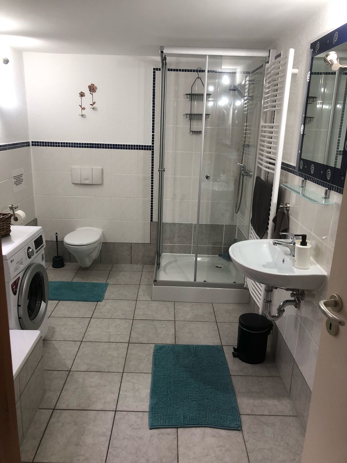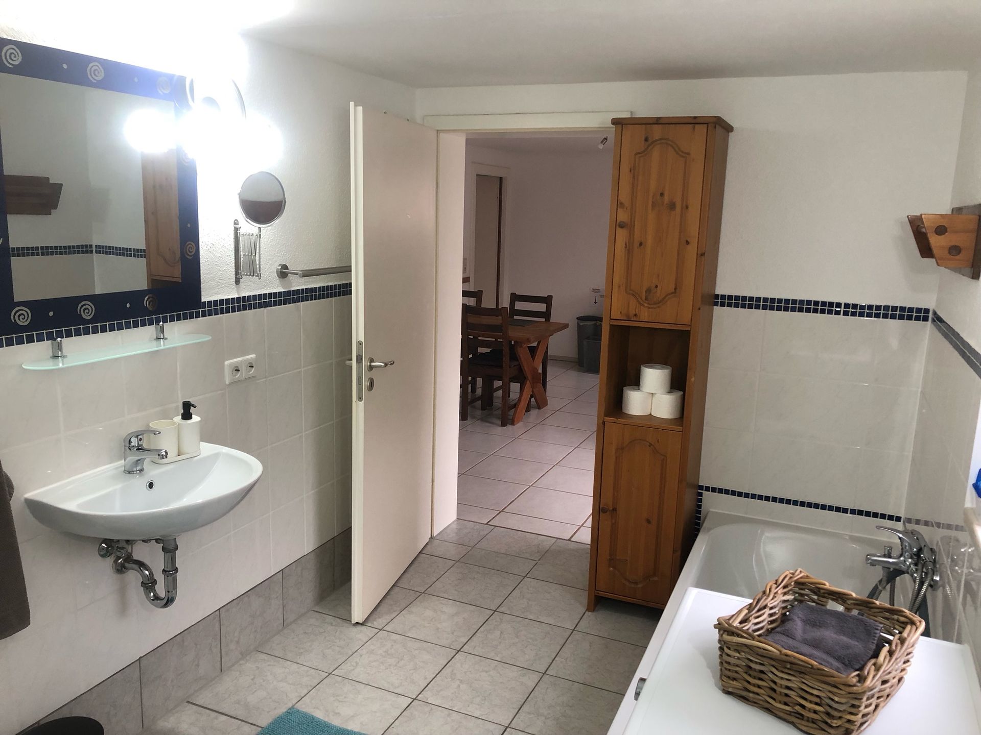 Von der Küche oder auch vom Flur aus gelangt man in das großzügige Badezimmer. Auf der einen Seite ist eine Badewanne für kalte Tage und ein WC. Eine Erweiterung dessen ist die Dusche und das Waschbecken. WC-Papier (Erstausstattung),